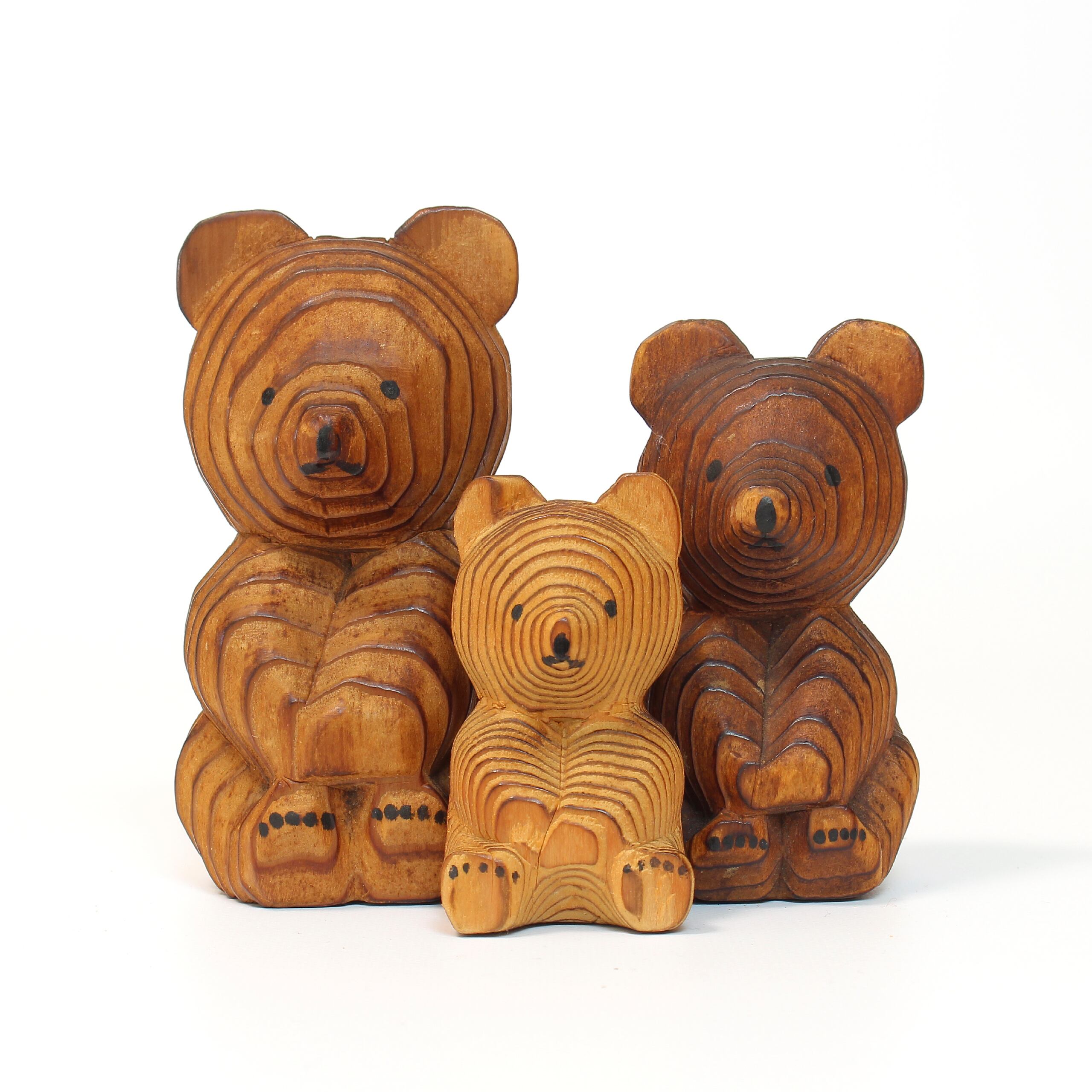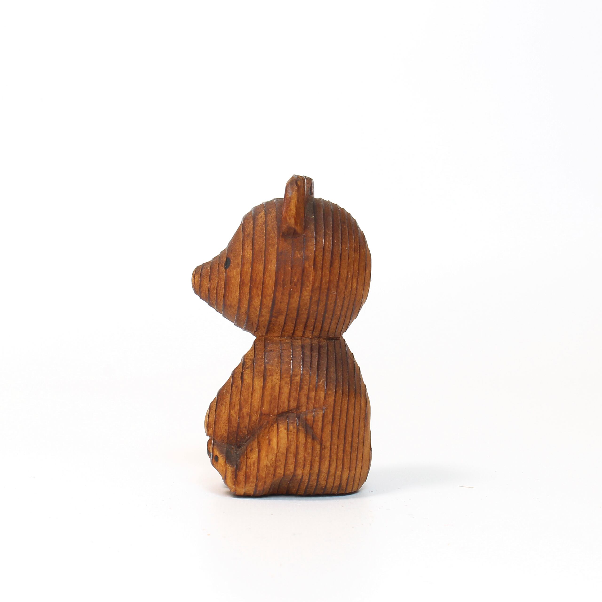北海道の民芸品:熊ボッコ。木の年輪を生かした素朴な置き物で、ついつい集めて並べたくなるビジュアルをしています。3つお迎えしたうちの真ん中サイズの熊さんです。