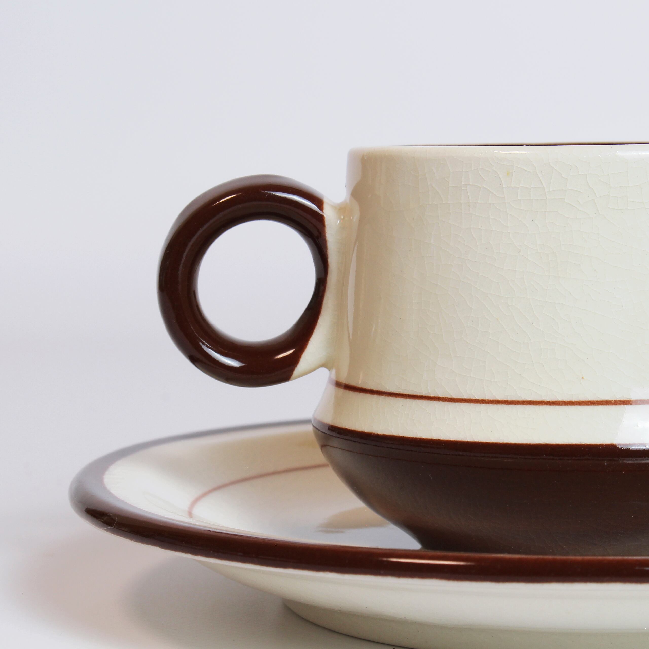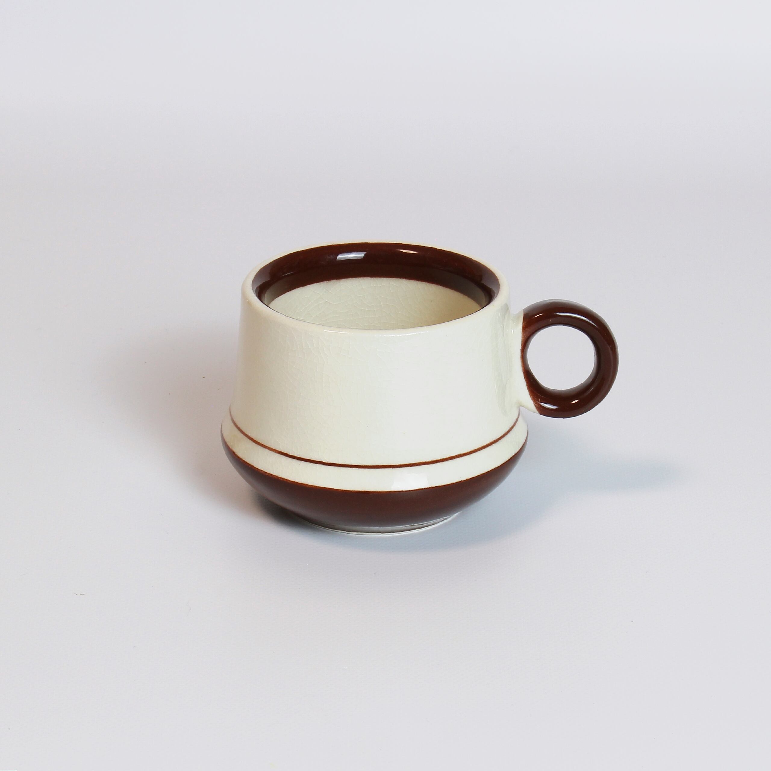 ジャパンヴィンテージのデミタスカップ&ソーサー。ブラウンラインのシンプルなデザインながら、カップのぽってりしたシルエットがたまらなくキュートです。デミタスカップの魅力は何といってもこのサイズ感!両手に収まる小さめサイズは、ミニチュアを眺めているようでときめきます。同デザインのシュガーポットもご用意しています。