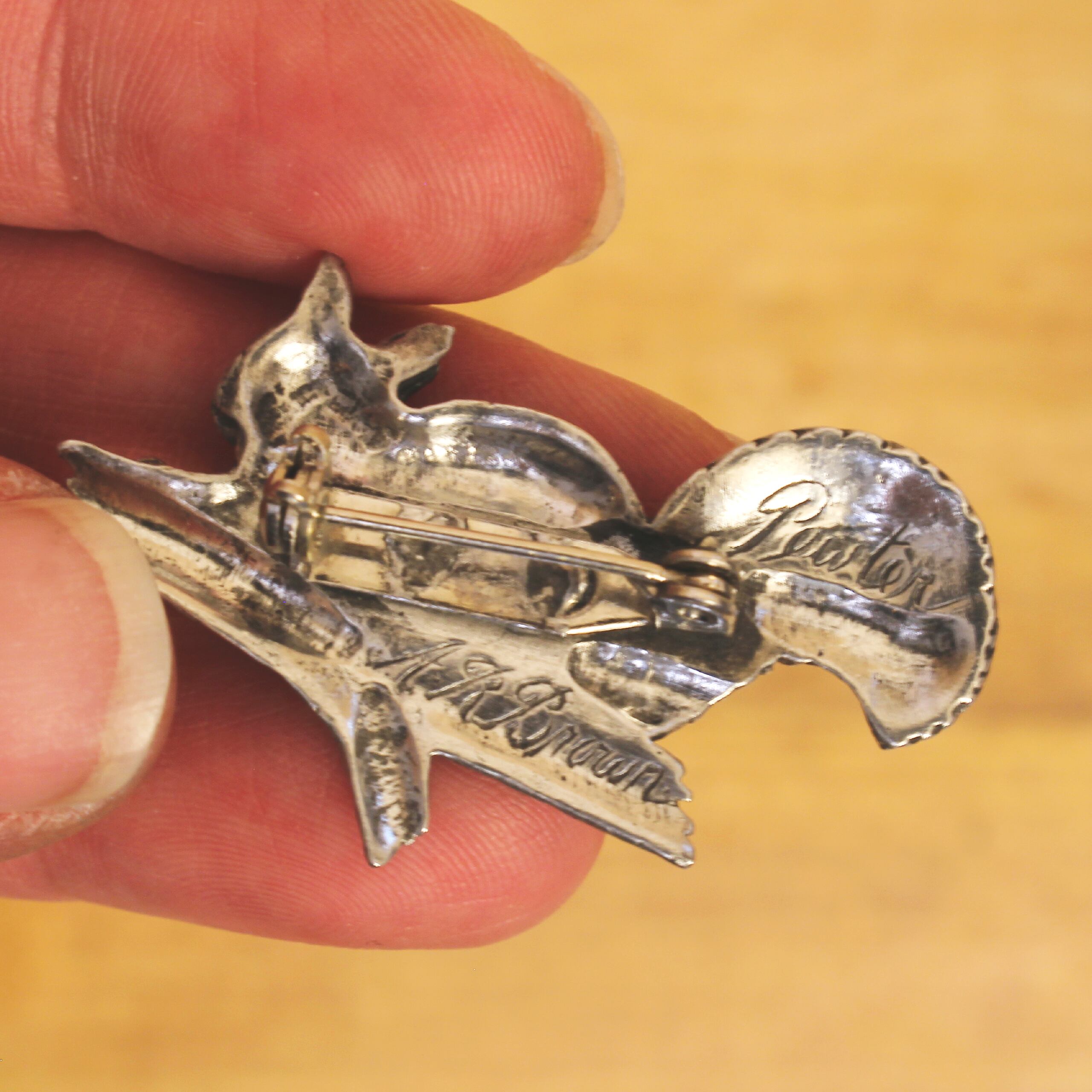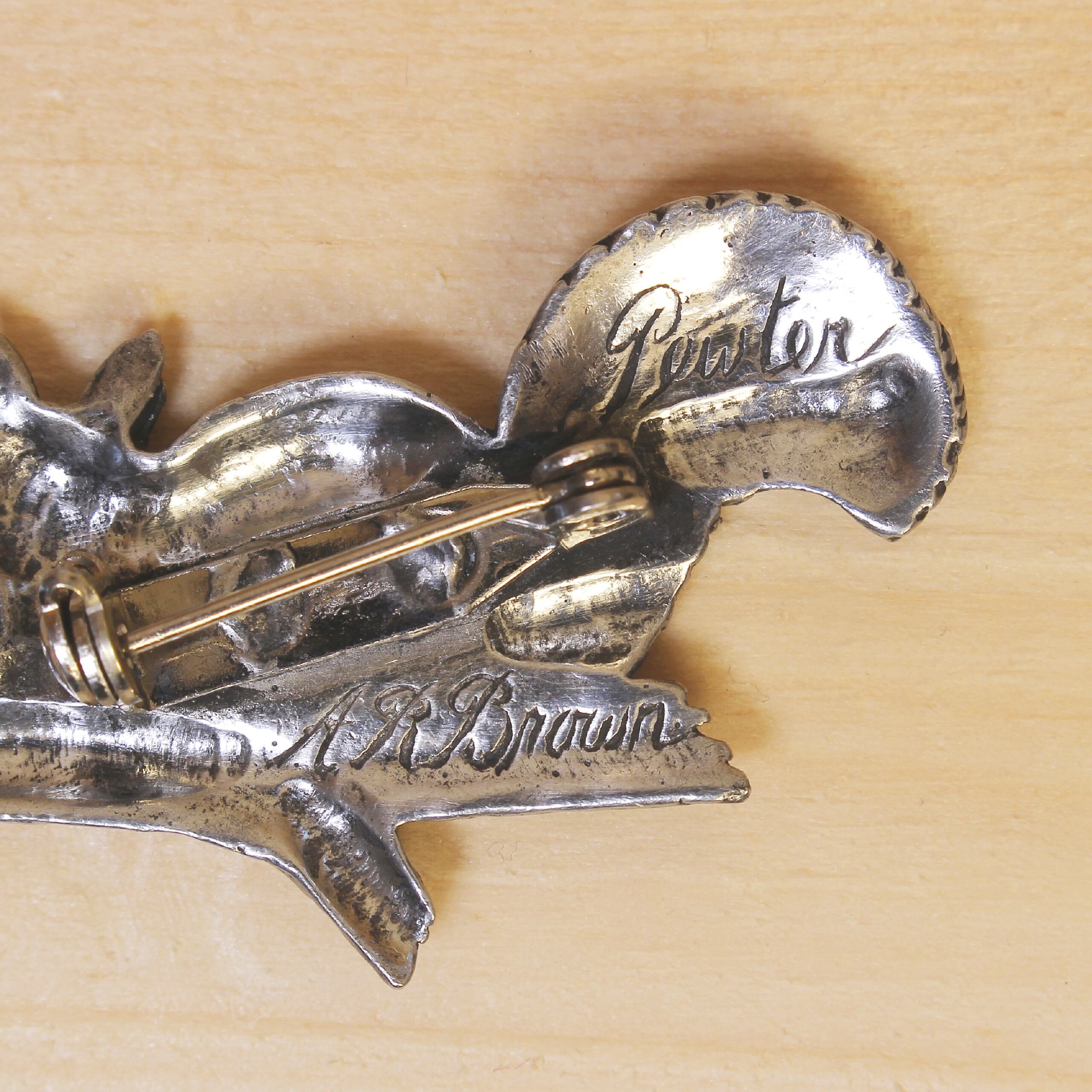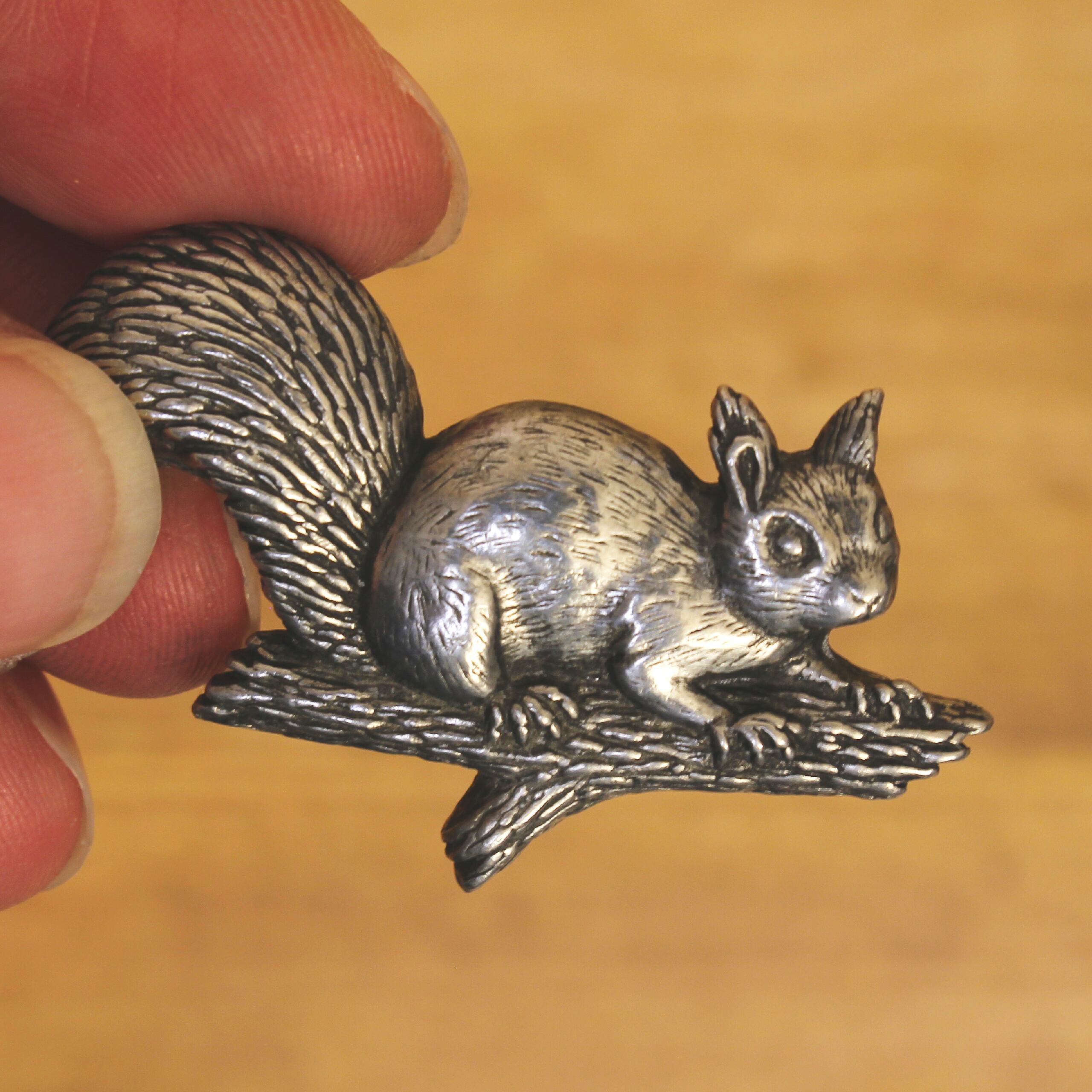 ブラウン・ピューターのリスのブローチ。木の枝にとまって、きょとんとした表情をしているのが何とも愛らしいです。落ち着いたトーンの色合いなので動物モチーフでもキュートになりすぎず、色んなコーディネートに取り入れていただけると思います◎