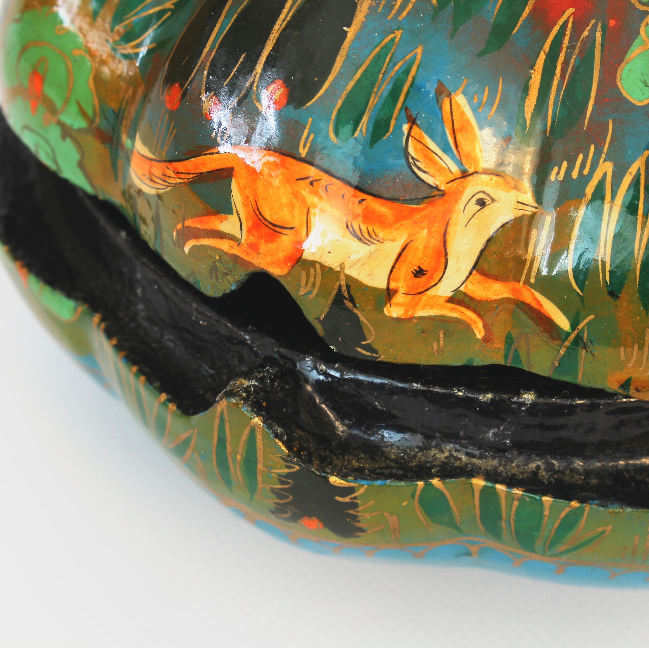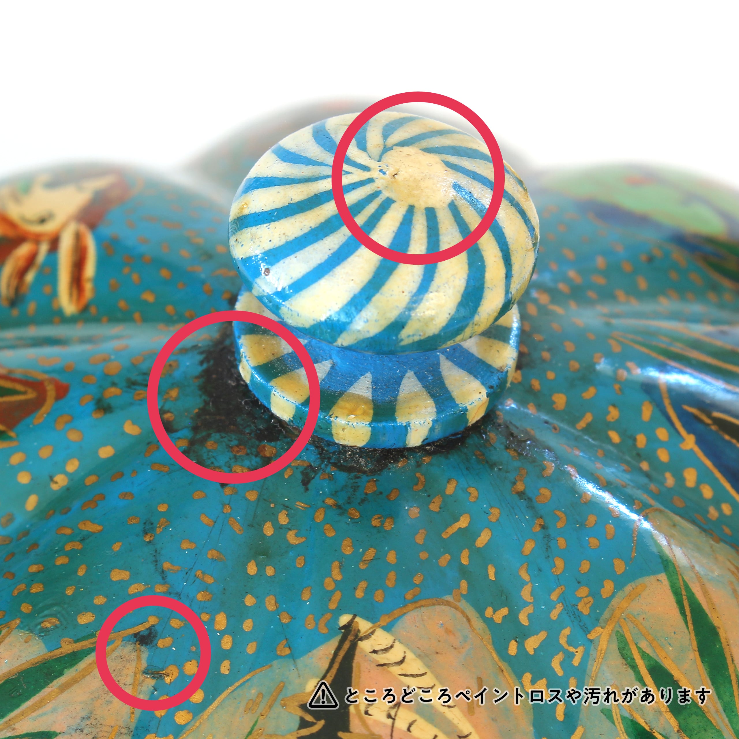 インド:カシミール地方の伝統的な紙細工"パピエマシェ"でつくられたパンプキン型の小物入れです。たくさんのシカやキツネたちが緑のなかを駆け回る様子が描かれていて、ついクルクルと回しながら眺めてしまいます。ストライプの持ち手もとってもキュート!噛み合わせ部分に突起があるので、かっちりと閉めることができます。