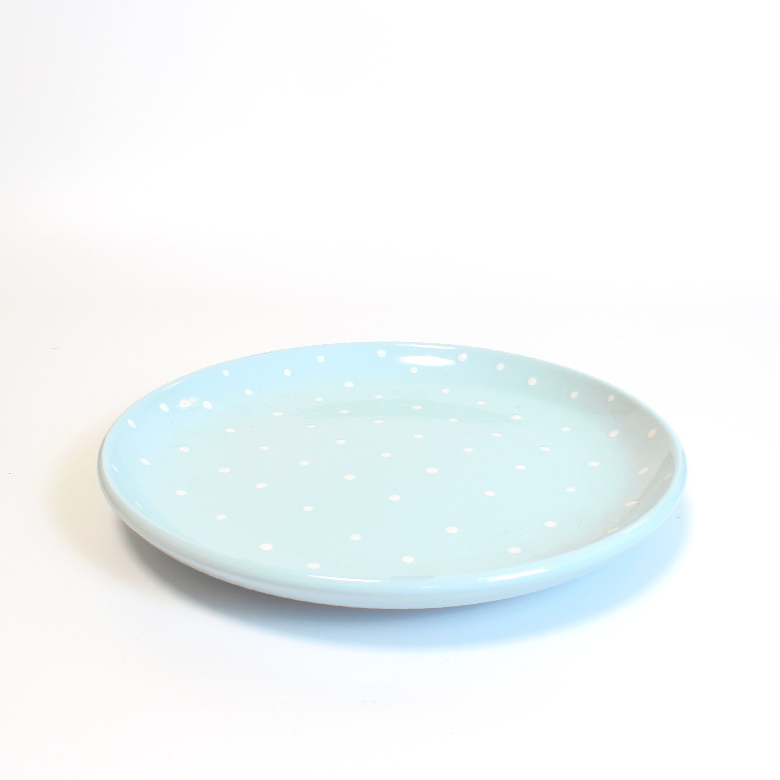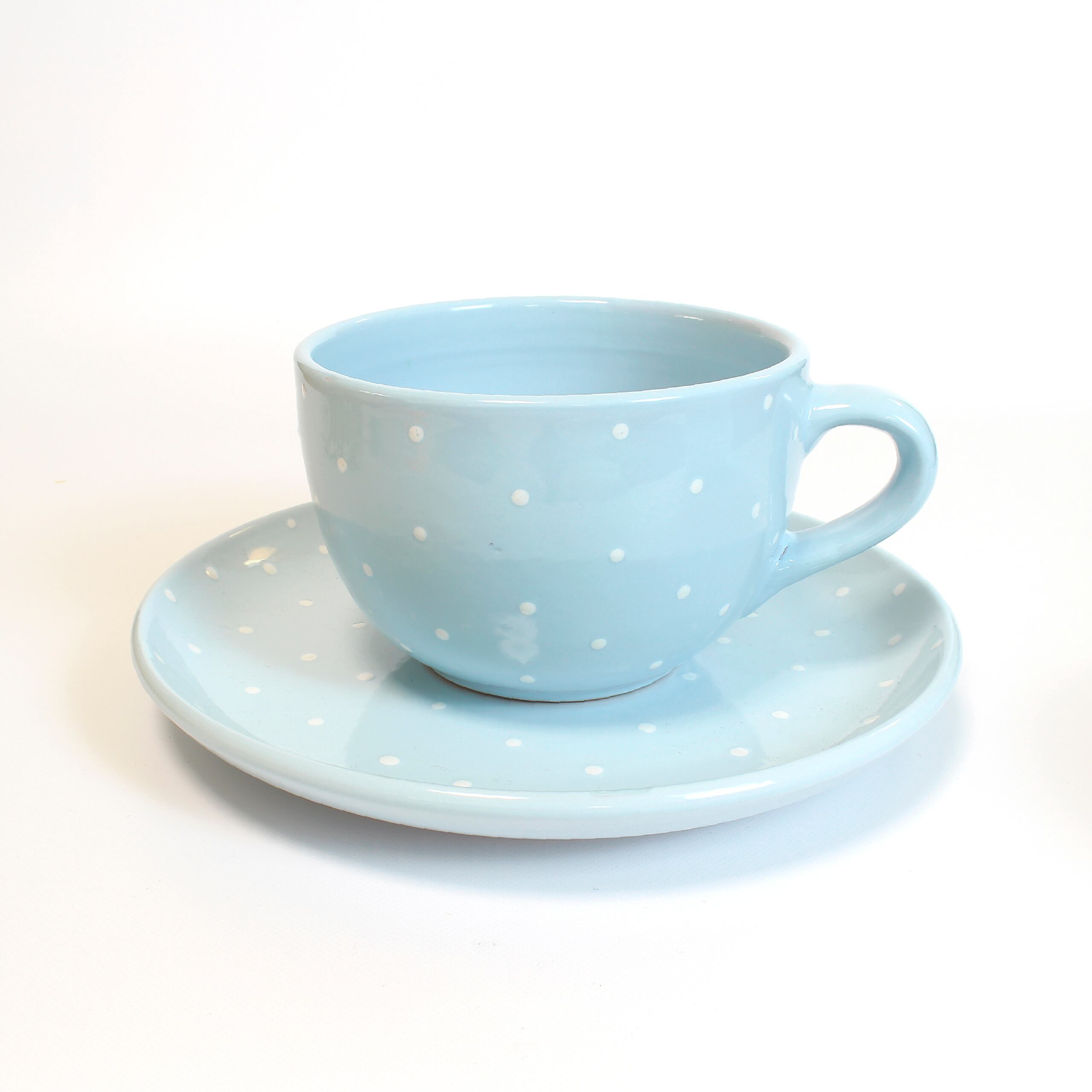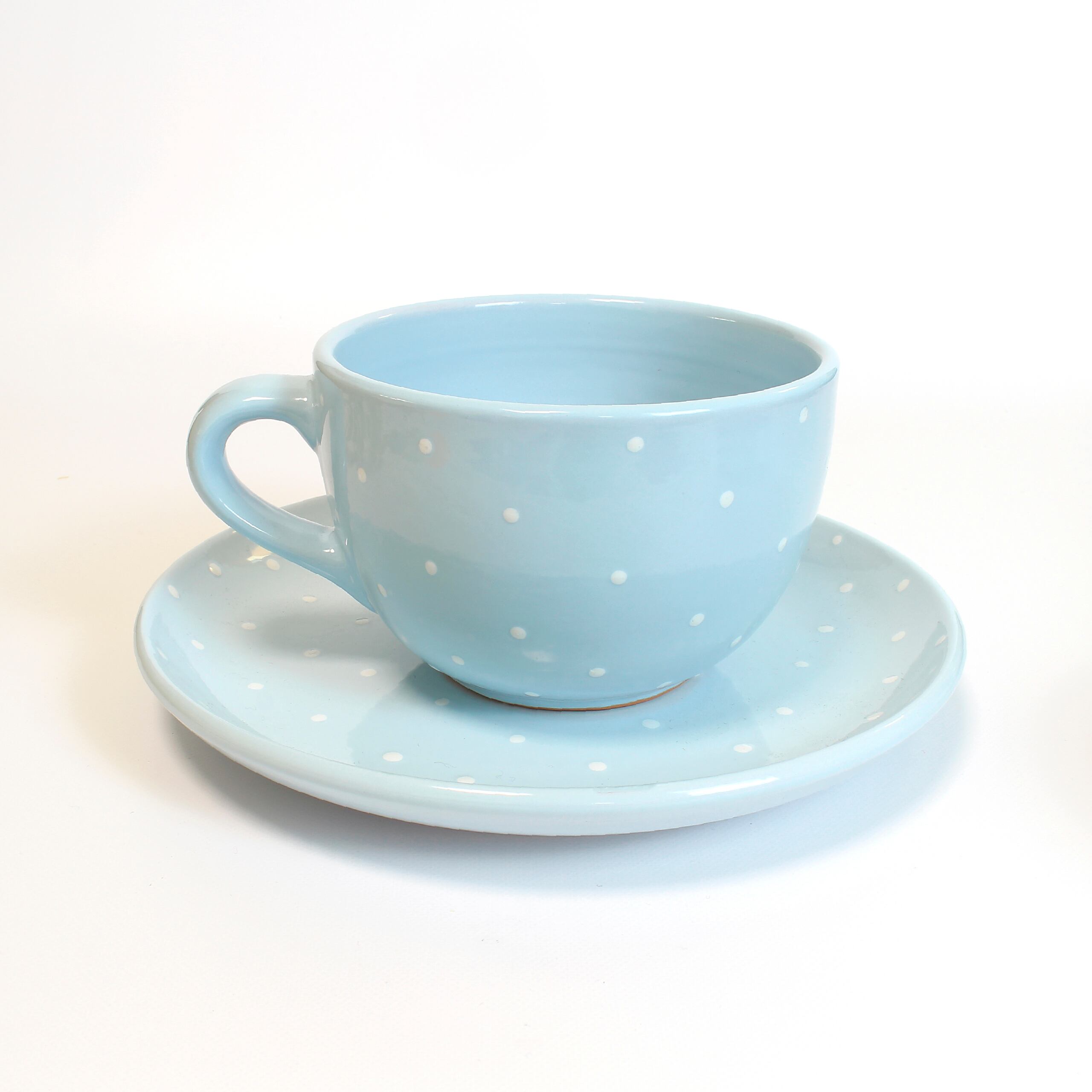 パステルブルーが爽やかなピンドットのカフェオレカップ&ソーサーです。厚手のぽってりとしたつくりで、大きなカップにくっついた小さめハンドルがたまりません◎ドットの部分はインクがぷくっとしていて、シンプルながらも愛らしいカップ&ソーサーです。