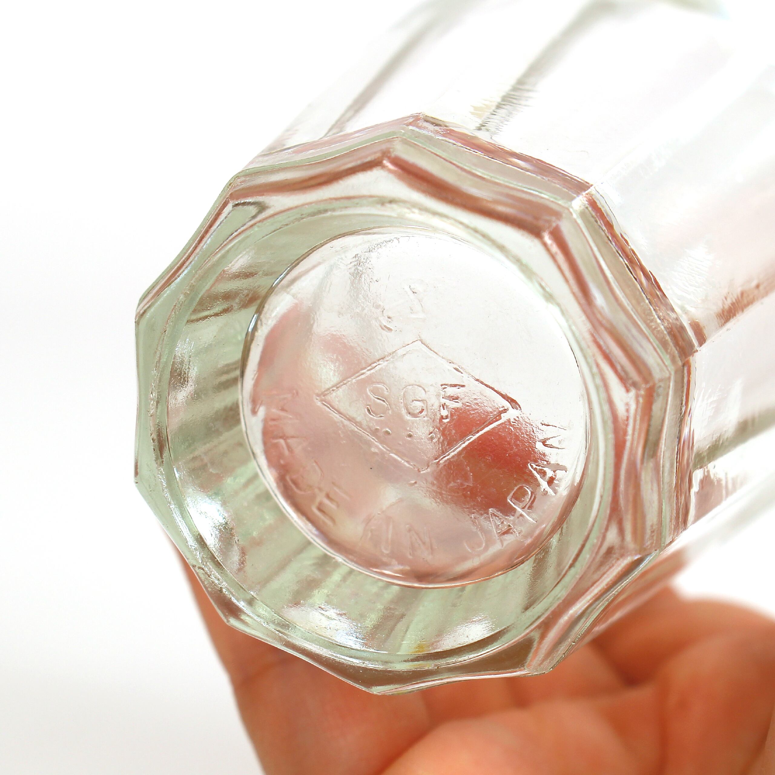 ジャパンヴィンテージのアンカーグラス。戦前後に缶の代用品として保存容器に利用されていたものです。厚ぼったくどっしりとしたビジュアルは無骨でとびきりクール!くすんだ色合いに無数のキズがなんともいえない、表情豊かなグラスです。