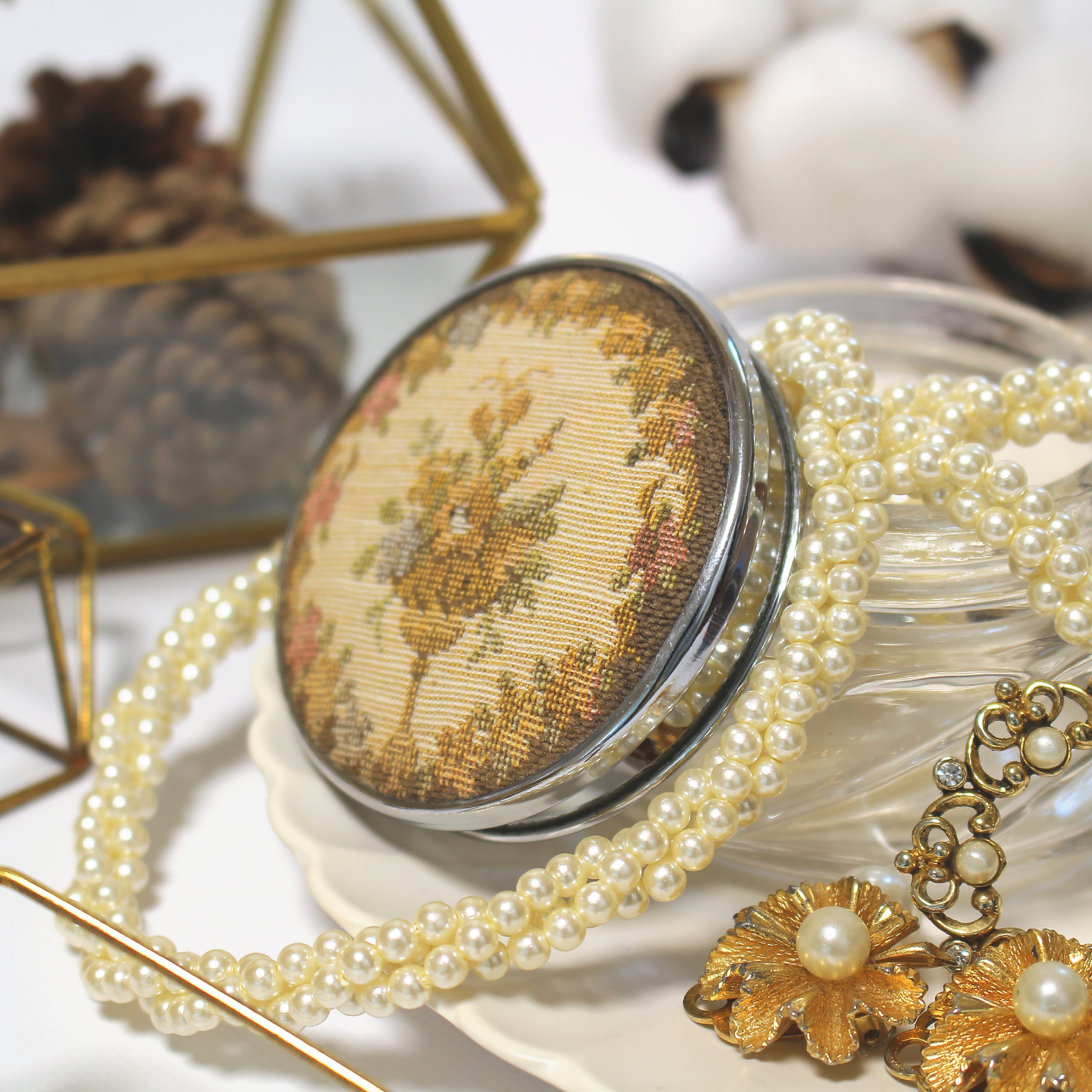 ゴブラン刺繍が施されたガラスジャー。セピア調にまとまったお花たちが上品で素敵です。ロンドンの古着屋さんで買い付けたもので、お店の一番奥にあったドレッサーにそっと飾られていました。アクセサリーなどの大切なものを入れて、目の留まるところに置いておきたくなるアイテムです。