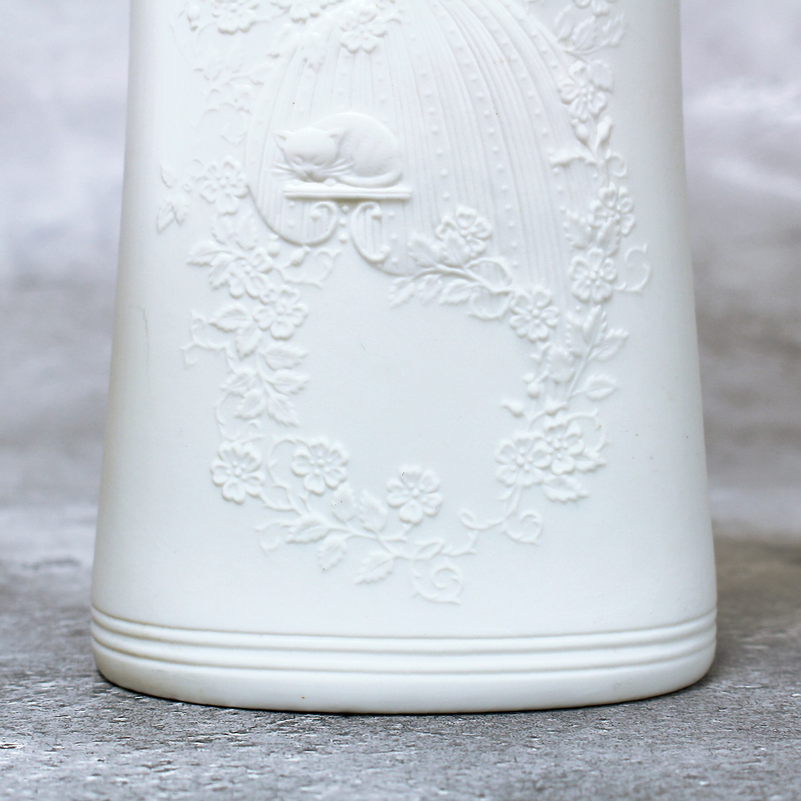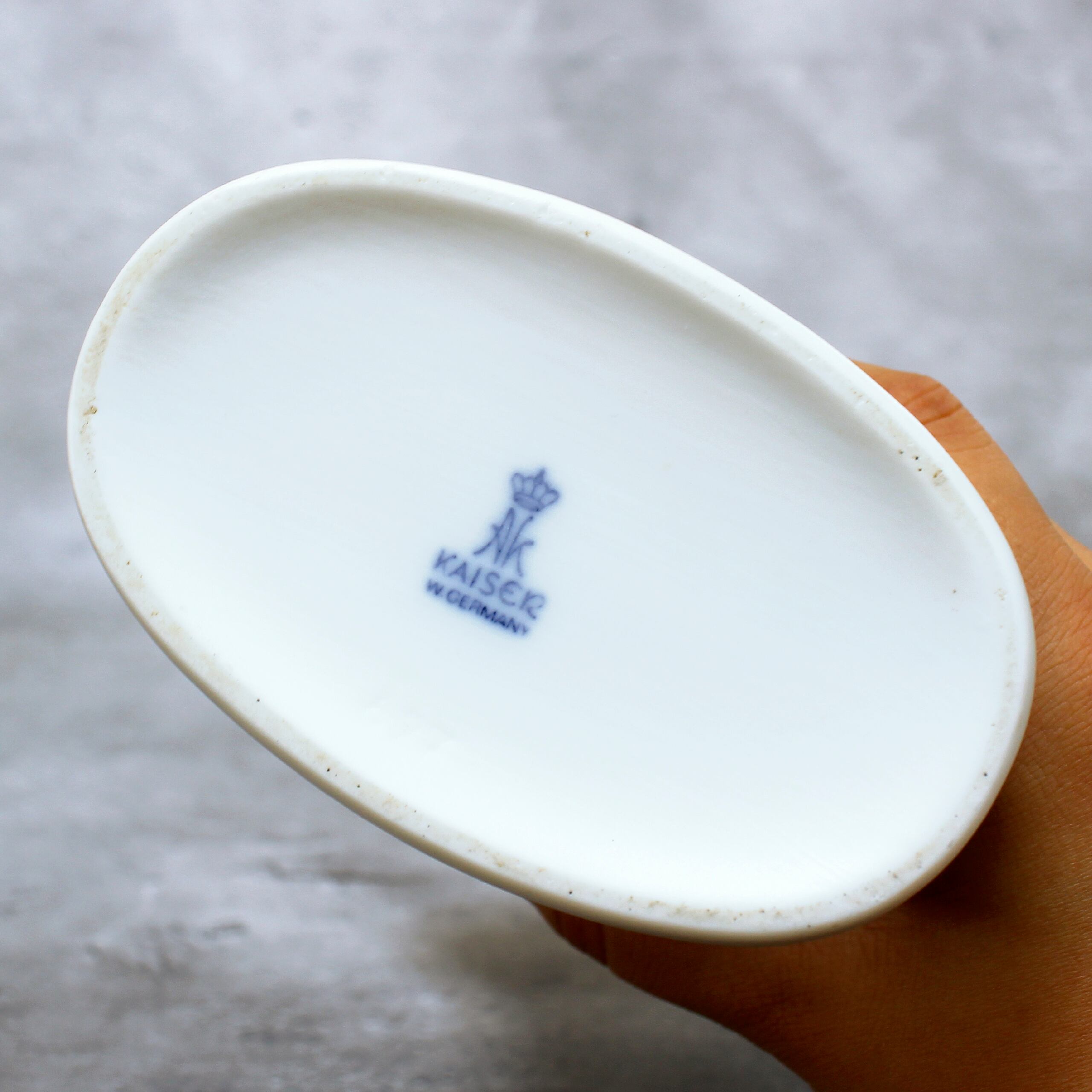 KAISERのフラワーベース。西ドイツでつくられたヴィンテージ品です。ホワイトのベースに少女やネコ、鳥やお花などがクラシカルに描かれています。白い花びんはどんなお花とも相性ばっちり◎パステルカラーのお花でフェミニンにまとめたり、ビビッドなお花を数本飾ったり…お部屋を彩ってくれること間違いなしです。