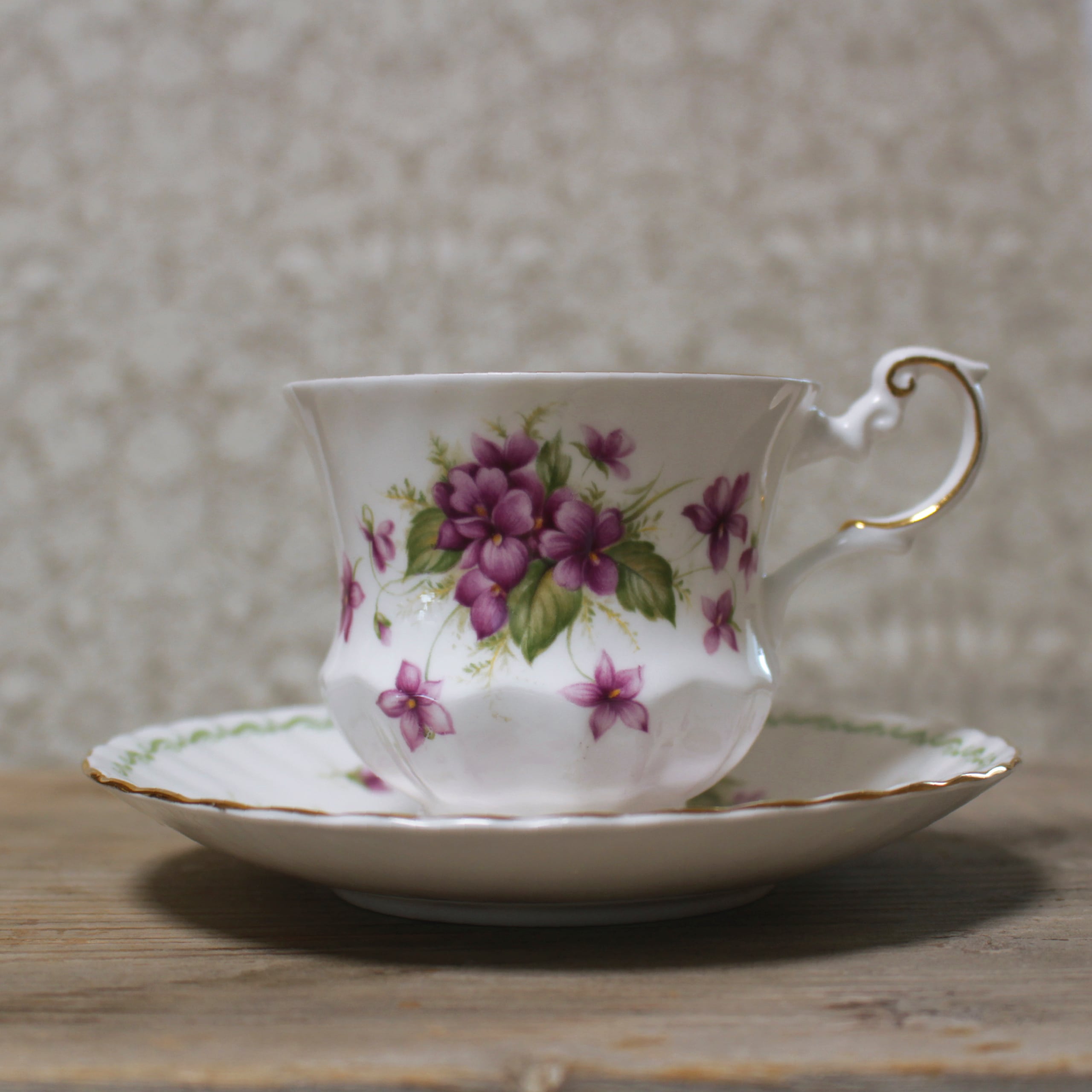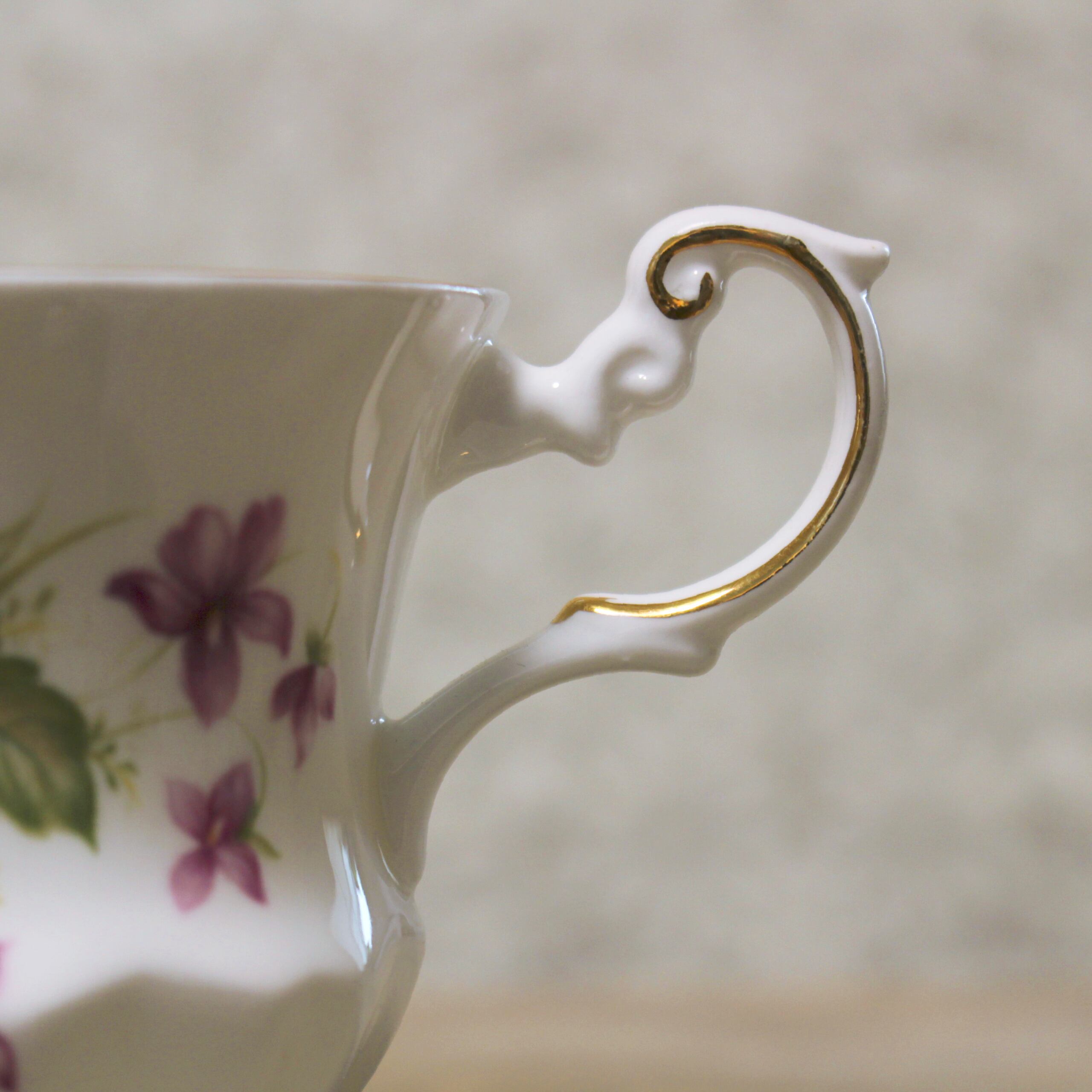 Rosina Chinaのカップ&ソーサー。"SPECIAL FLOWERS"というシリーズのもので、スミレがあしらわれています。ふんわりとした輪郭で描かれたスミレは、眺めているだけで時間の流れがゆったりとしてくるような気持ちにさせてくれます。カップの内側に至るまで贅沢に敷かれた花々、ウェーブしたテクスチャのソーサー、優雅なフォルムをしたハンドルなど、どこを取ってもとびきり華やかなアイテムです。