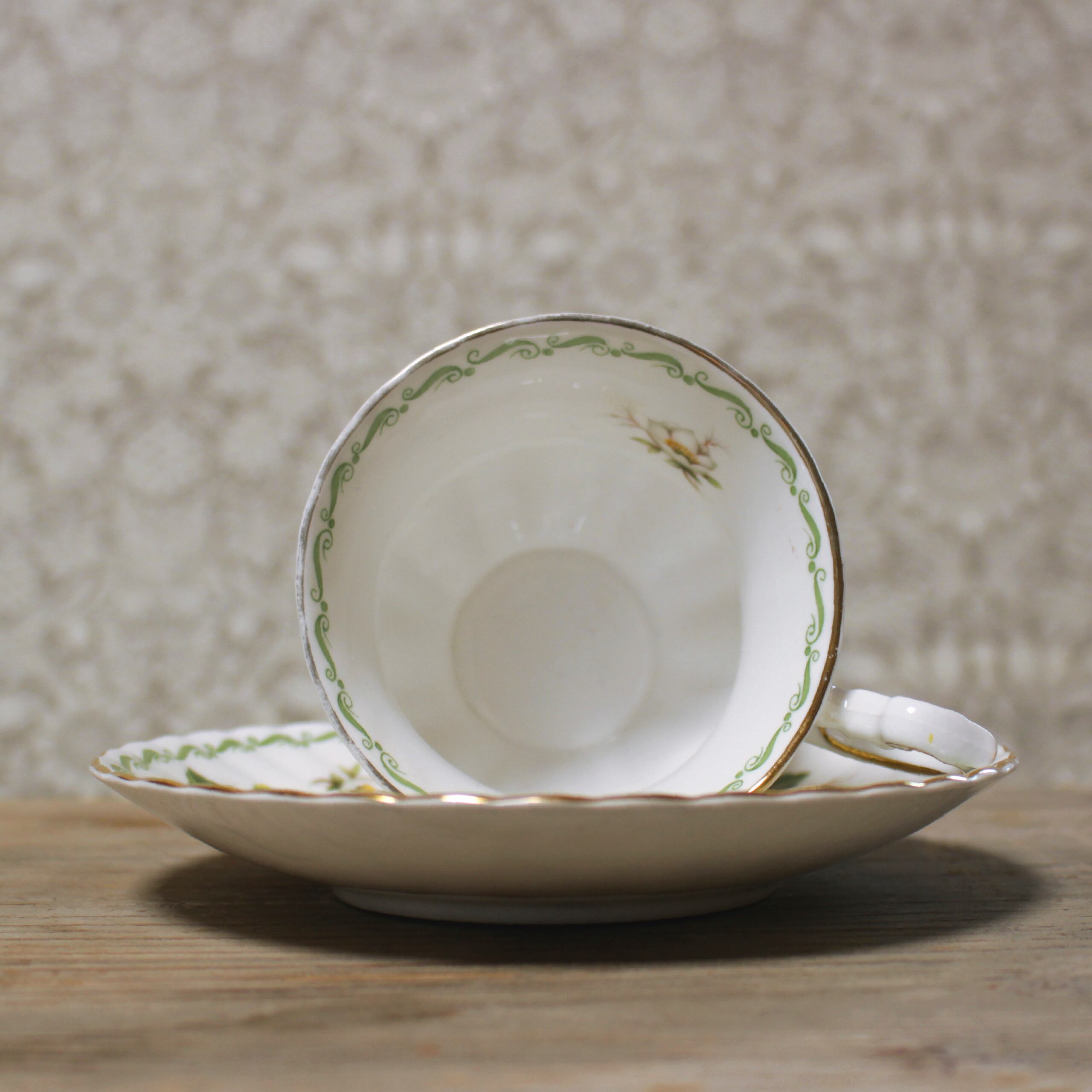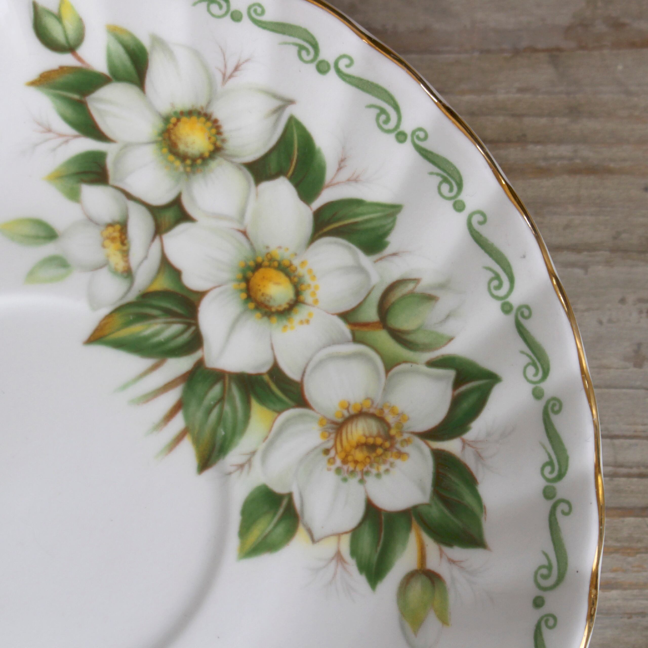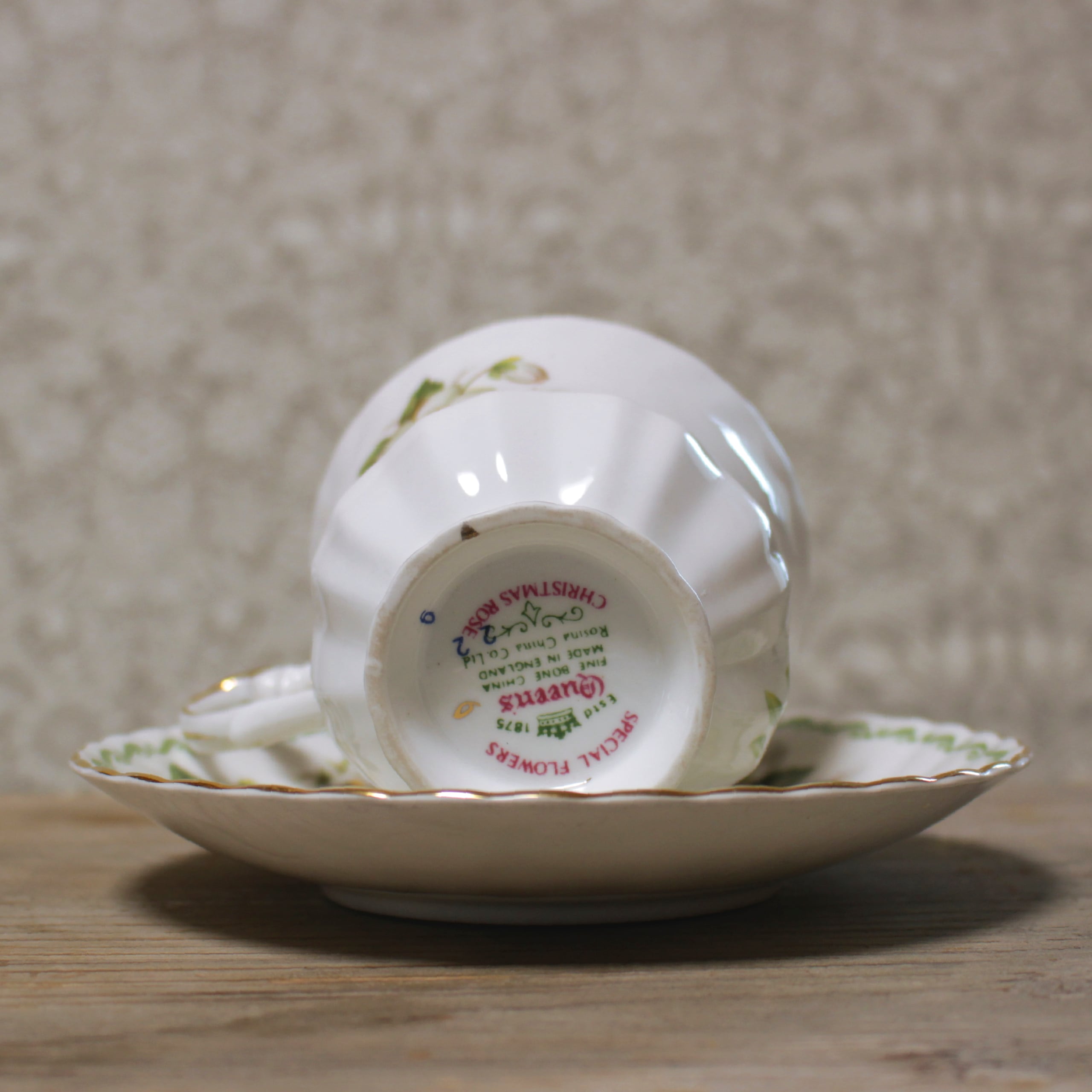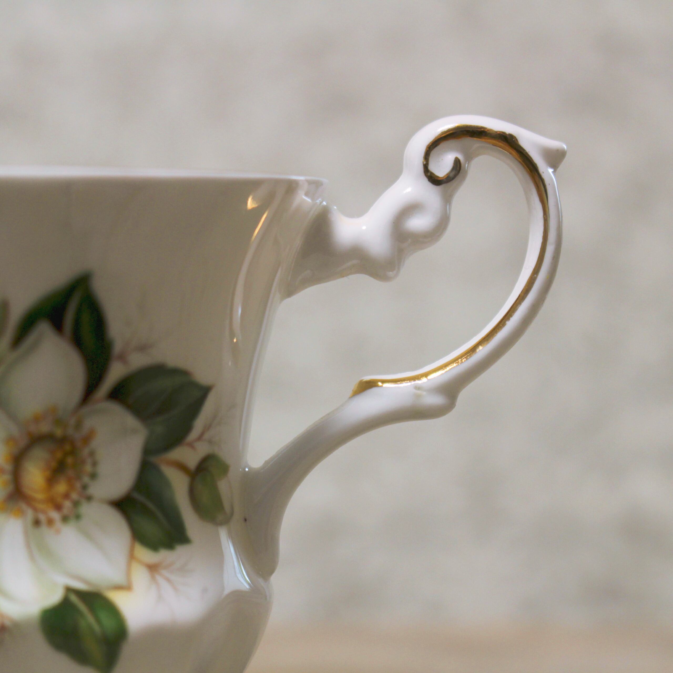 Rosina Chinaのカップ&ソーサー。"SPECIAL FLOWERS"というシリーズのもので、クリスマスローズがあしらわれています。ホワイトとグリーンでまとめられていて、すっきりとした美しさのなかに愛らしさも感じることができます。カップの内側に至るまで贅沢に敷かれた花々、ウェーブしたテクスチャのソーサー、優雅なフォルムをしたハンドルなど、どこを取ってもとびきり華やかなアイテムです。