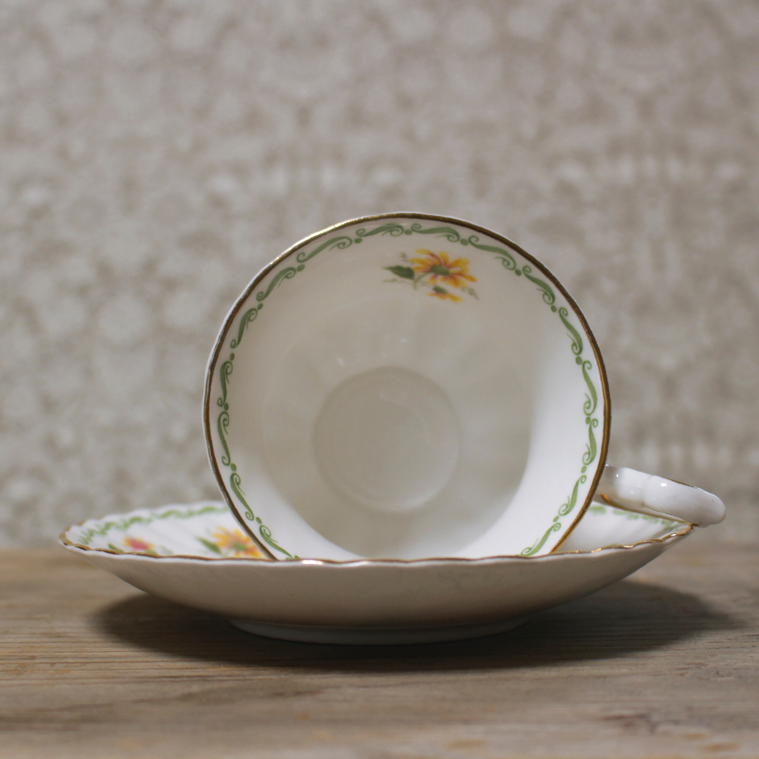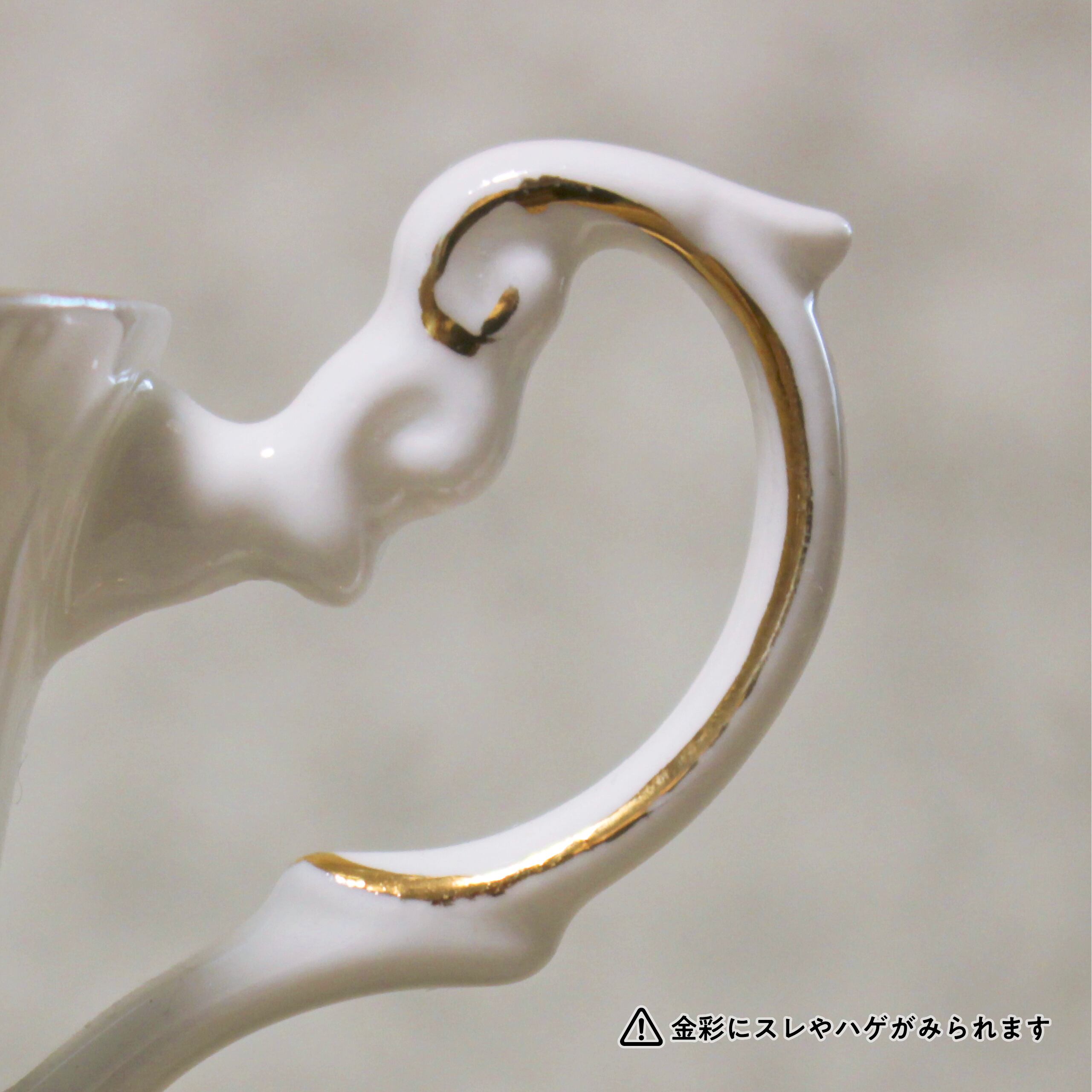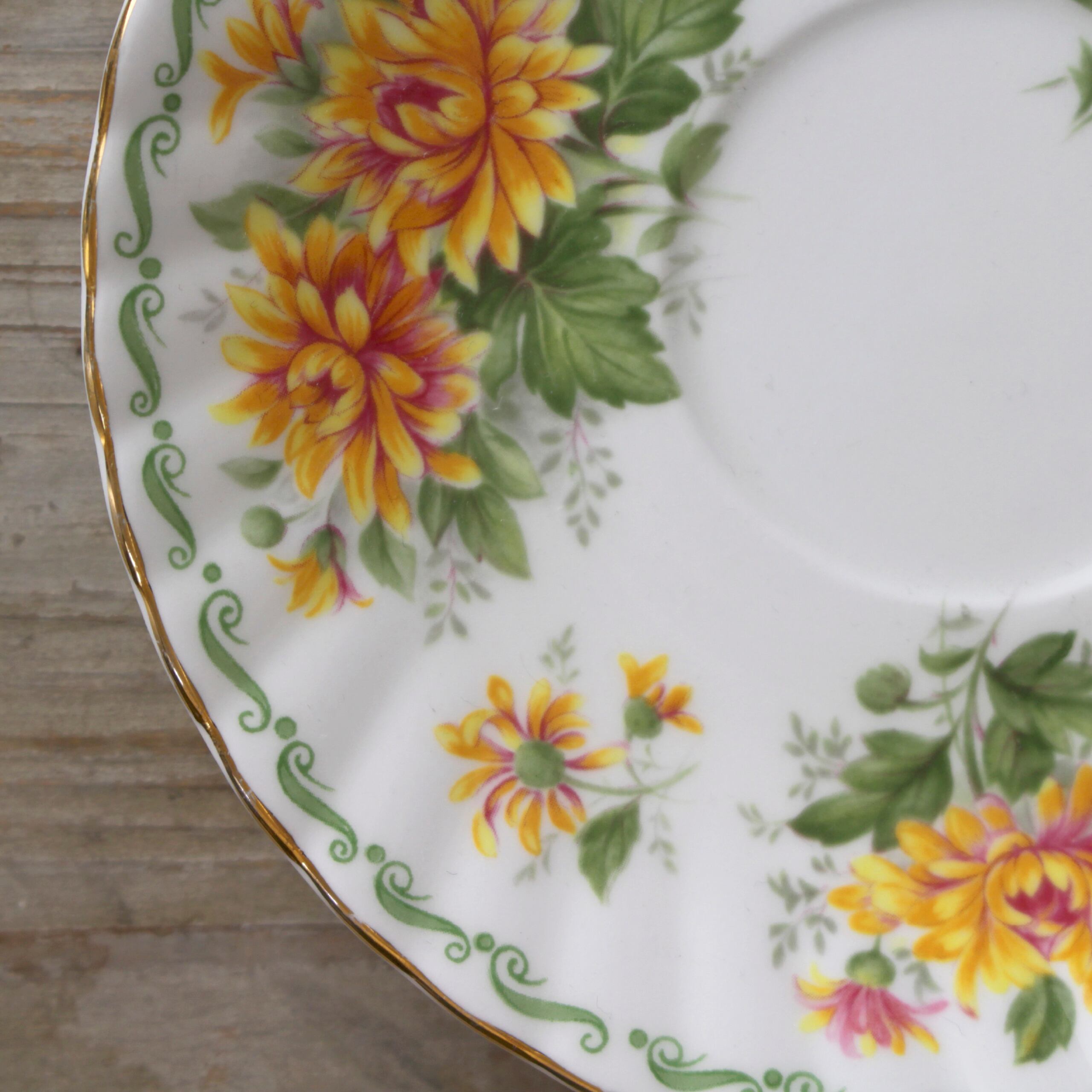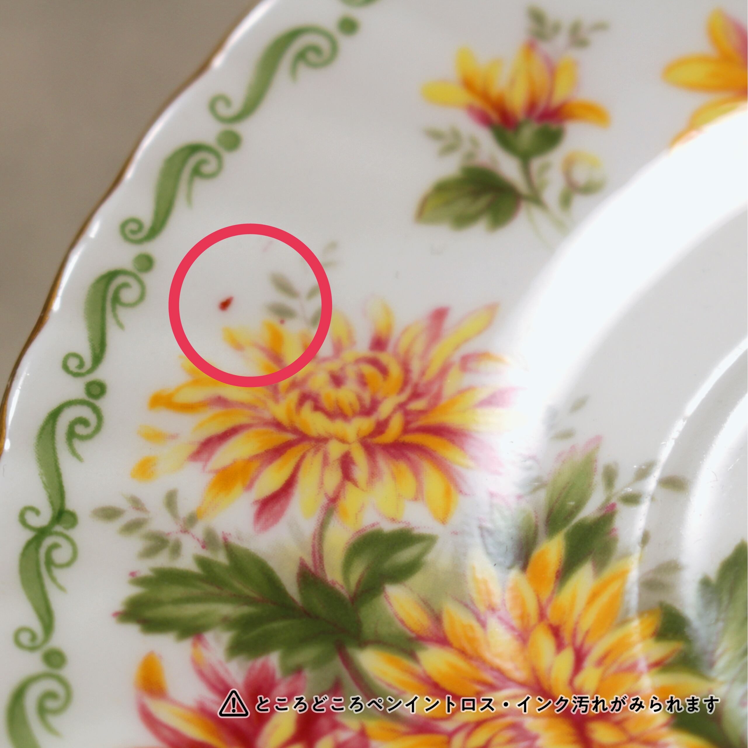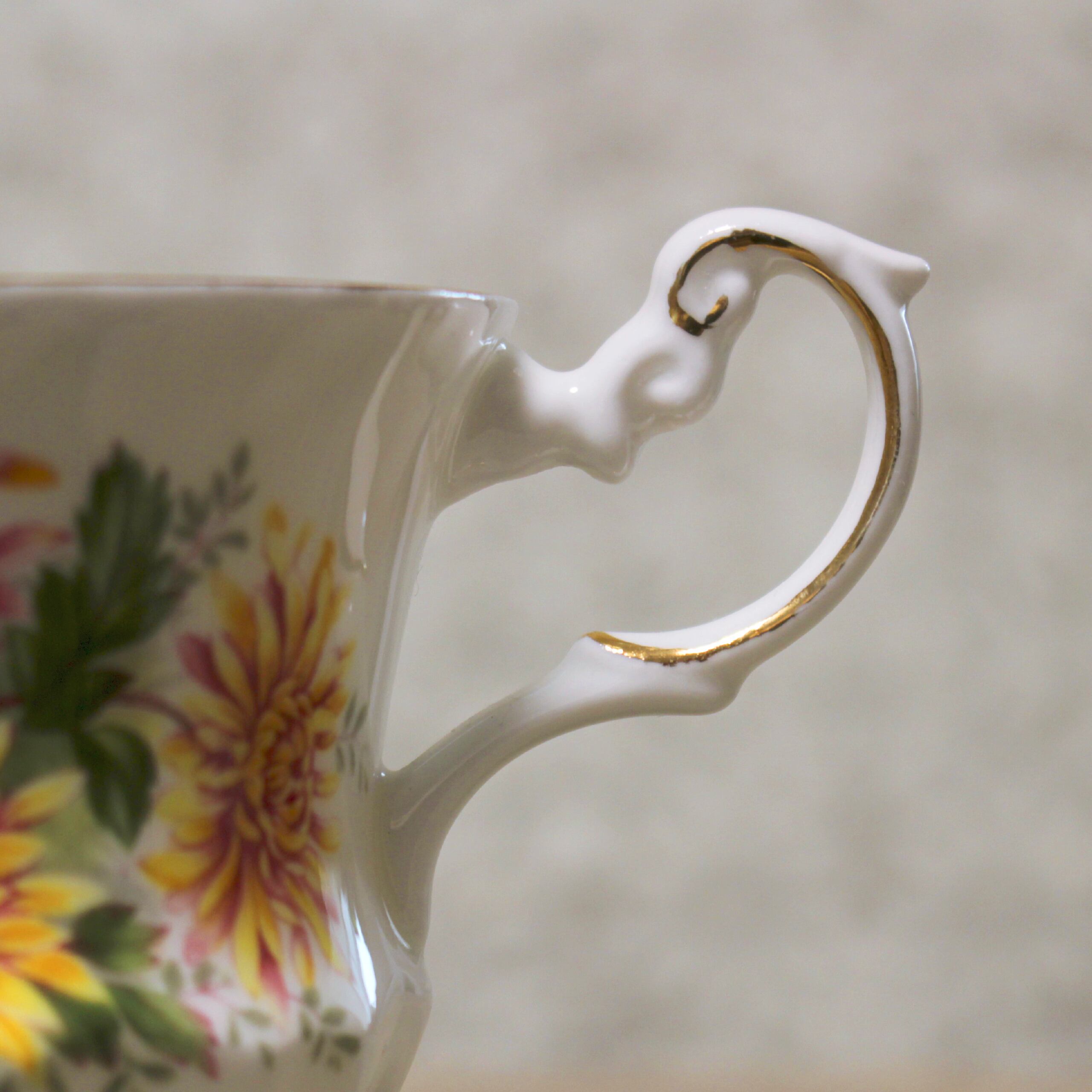 Rosina Chinaのカップ&ソーサー。"SPECIAL FLOWERS"というシリーズのもので、クリサンセマム(菊)があしらわれています。生き生きと描かれたマムは今まさに花開いた瞬間を思わせ、ついじっと眺めてしまう美しさ。カップの内側に至るまで贅沢に敷かれた花々、ウェーブしたテクスチャのソーサー、優雅なフォルムをしたハンドルなど、どこを取ってもとびきり華やかなアイテムです。