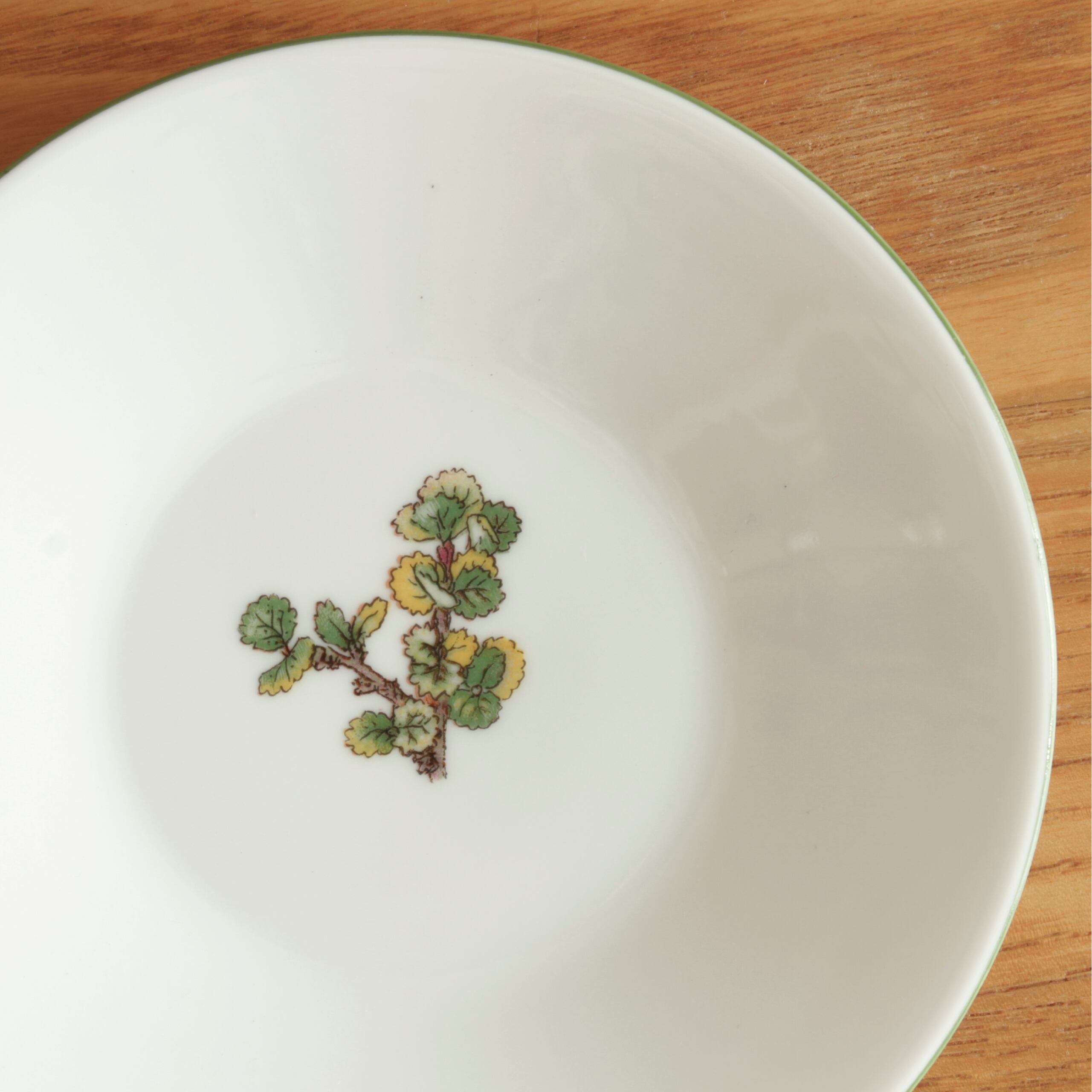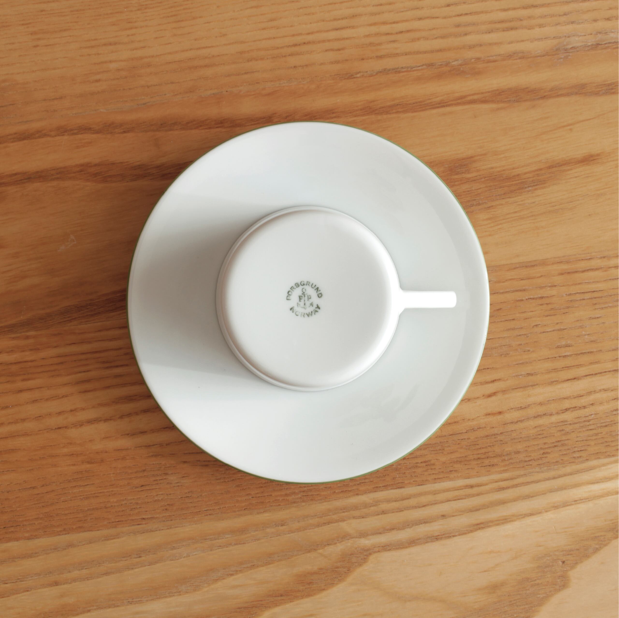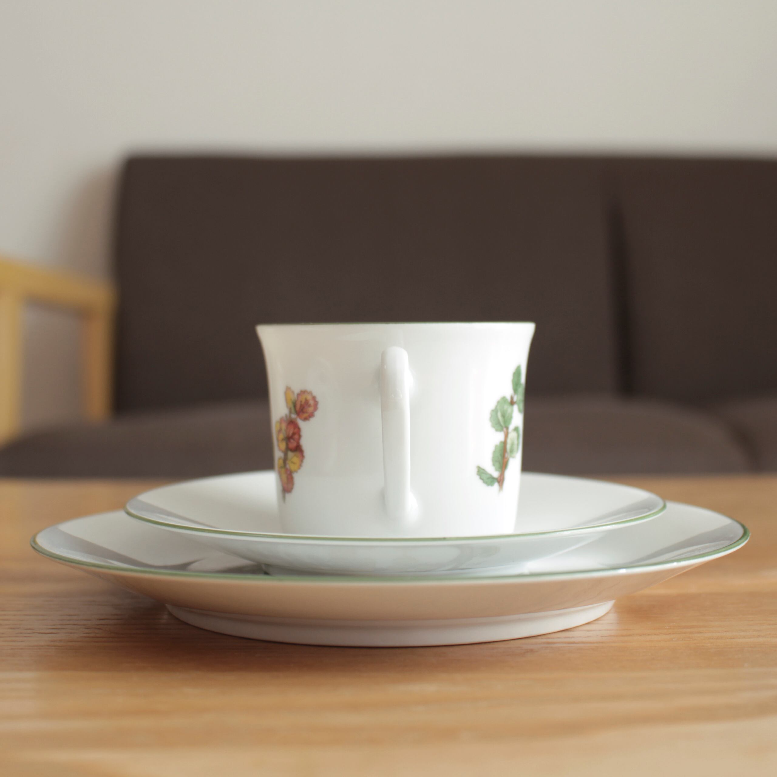 PORSGRUNDのトリオセット(カップ&ソーサー+プレート)。"MOUNTAIN FLOWER "という高山植物のイラストがあしらわれたシリーズのもので、こちらに描かれているのはヒメカンバという植物かと思われます。プレーンなデザインのカップやプレートに、繊細な植物のイラストがよく映えます。どれも異なる描写がされていて、角度によって違った雰囲気を楽しめるのもポイント。プレート裏にはヒメカンバの紹介文も掲載されているなど、遊びごころも含んだユニークなトリオセットです。