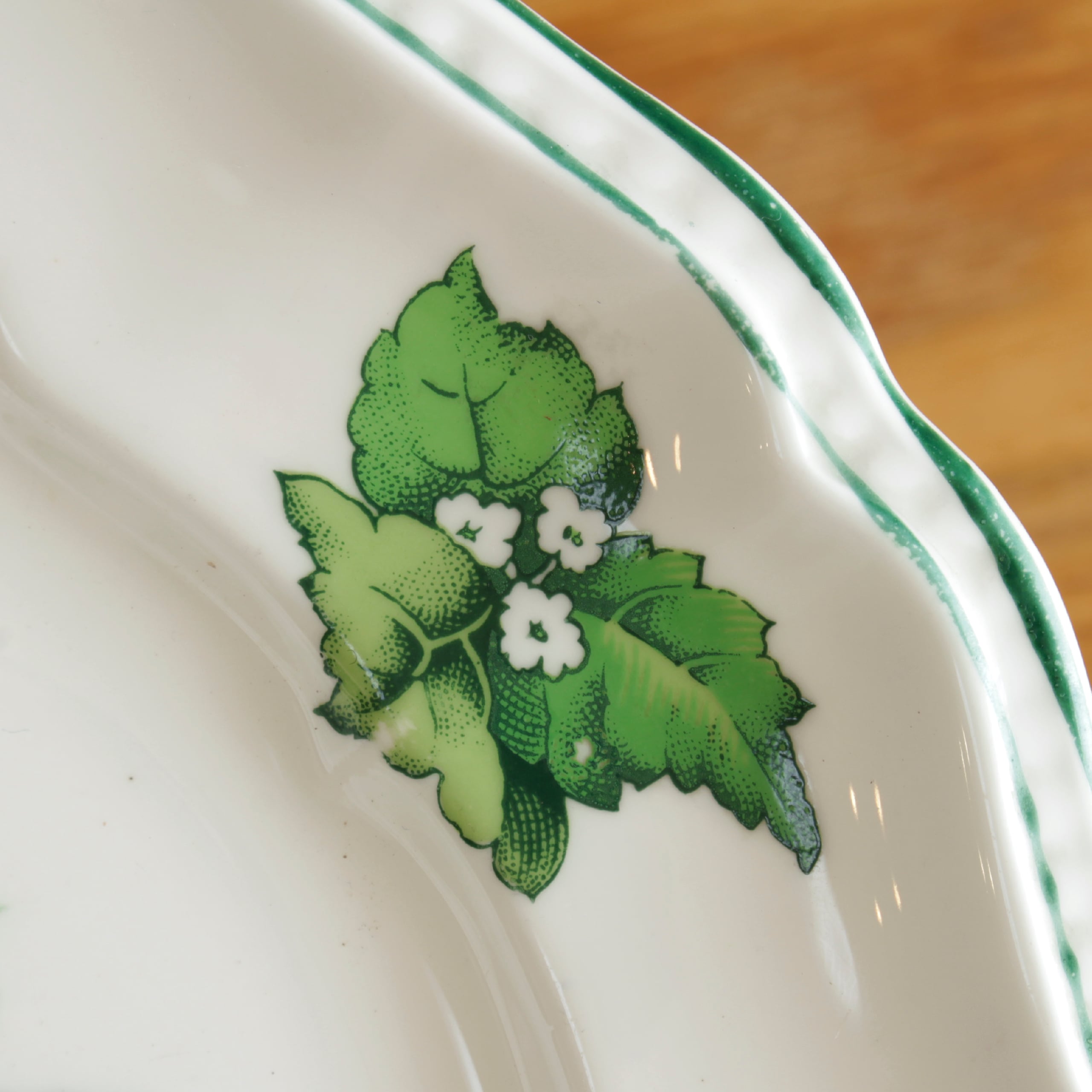 STAFFORD SHIREのサラダプレート。フレッシュなグリーンに白い小花が可愛らしい1枚です。リム部分にも細かく装飾が施されていて、見ているだけでも心がうきうきしてしまいます。