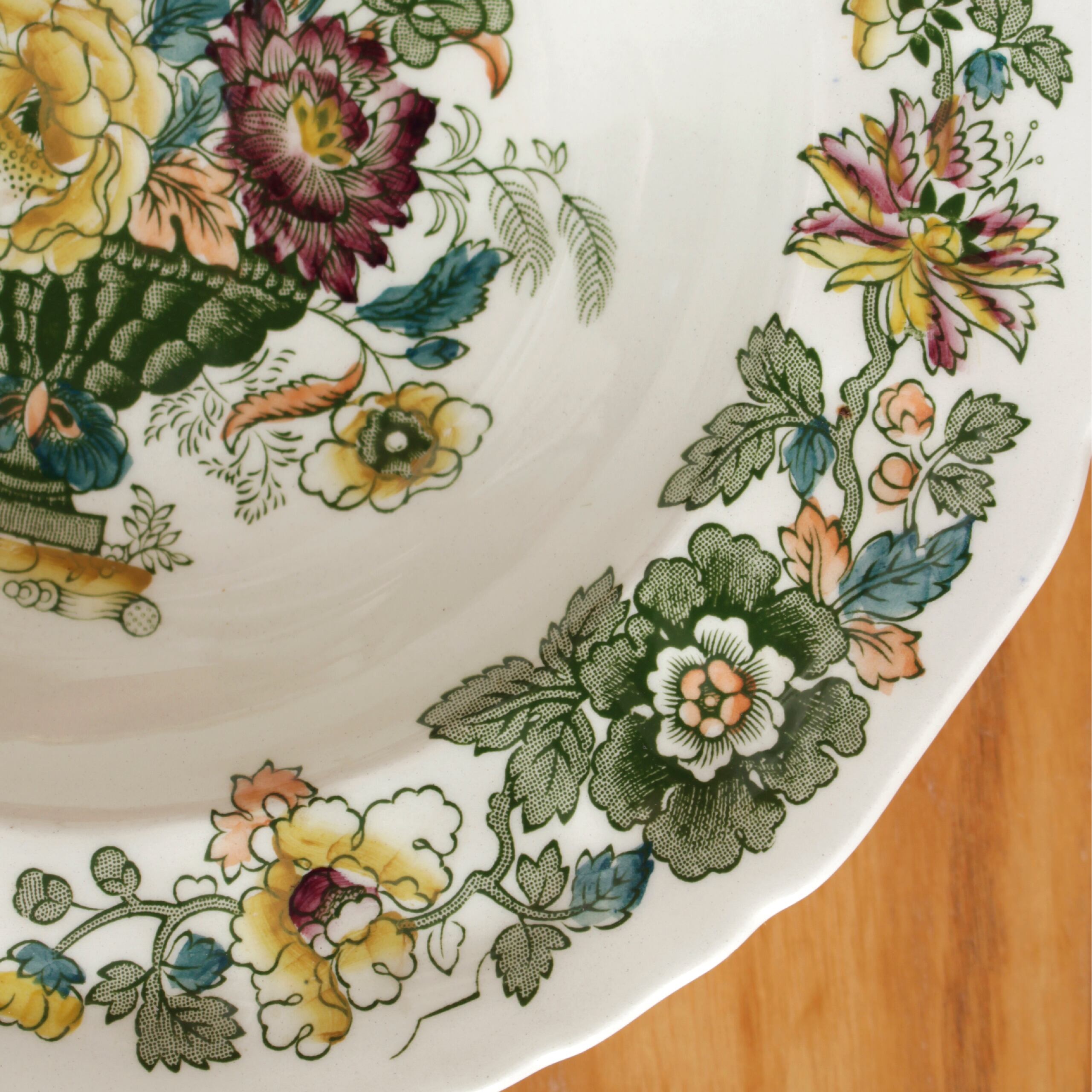MASON'Sのスーププレート。Strathmoreと呼ばれるシリーズのもので、グリーンのイラストをベースにイエローやパープルなどがハンドペイントされた華やかなお皿です。プレート全面にたっぷりと描かれた花々は、その一つひとつを眺めているだけでも満ち足りた気持ちに…。スタンドに立てかけたり壁に掛けたりと、インテリアとして取り入れていただいても素敵です◎