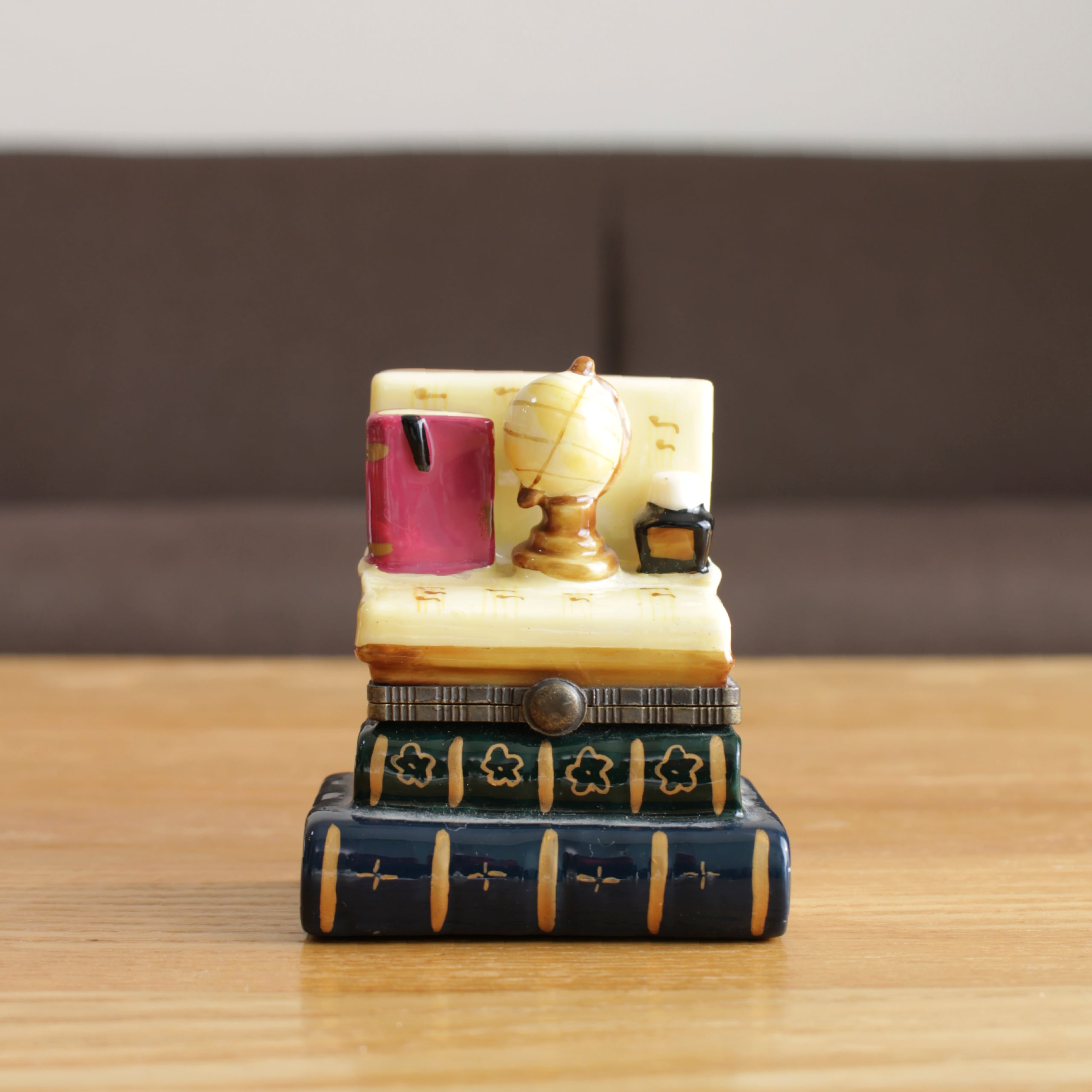 トリンケットとは小物や飾りを意味する言葉で、トリンケットBOXは小さなジュエリーケースや小物入れのことを指します。そのほとんどがそのままオブジェとして飾れるような見た目をしており、こちらのBOXも書斎のアイテムを模したミニチュア仕立てとなっています。本や地球儀、インクボトルなど、どれも細かく作られていてとってもキュートです。