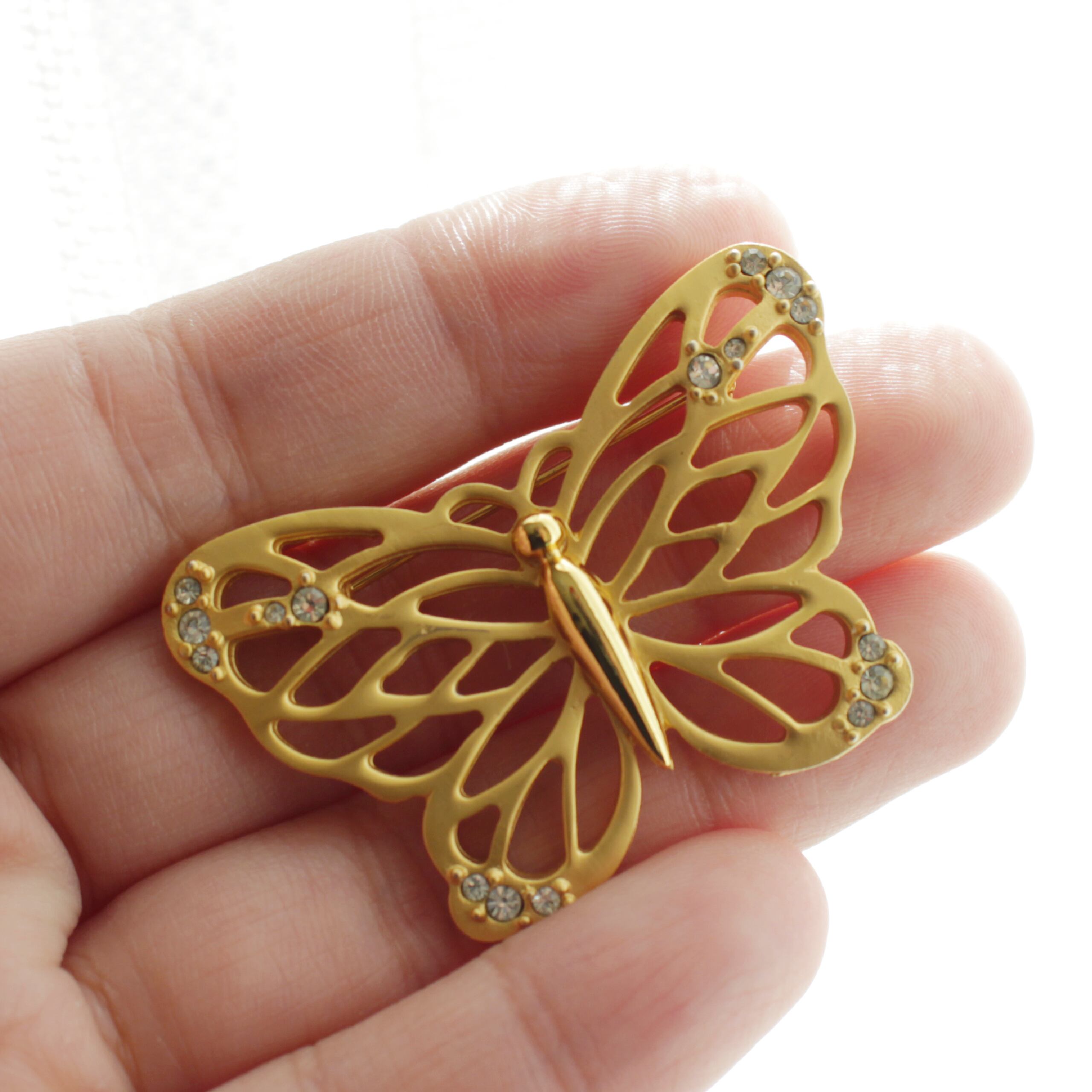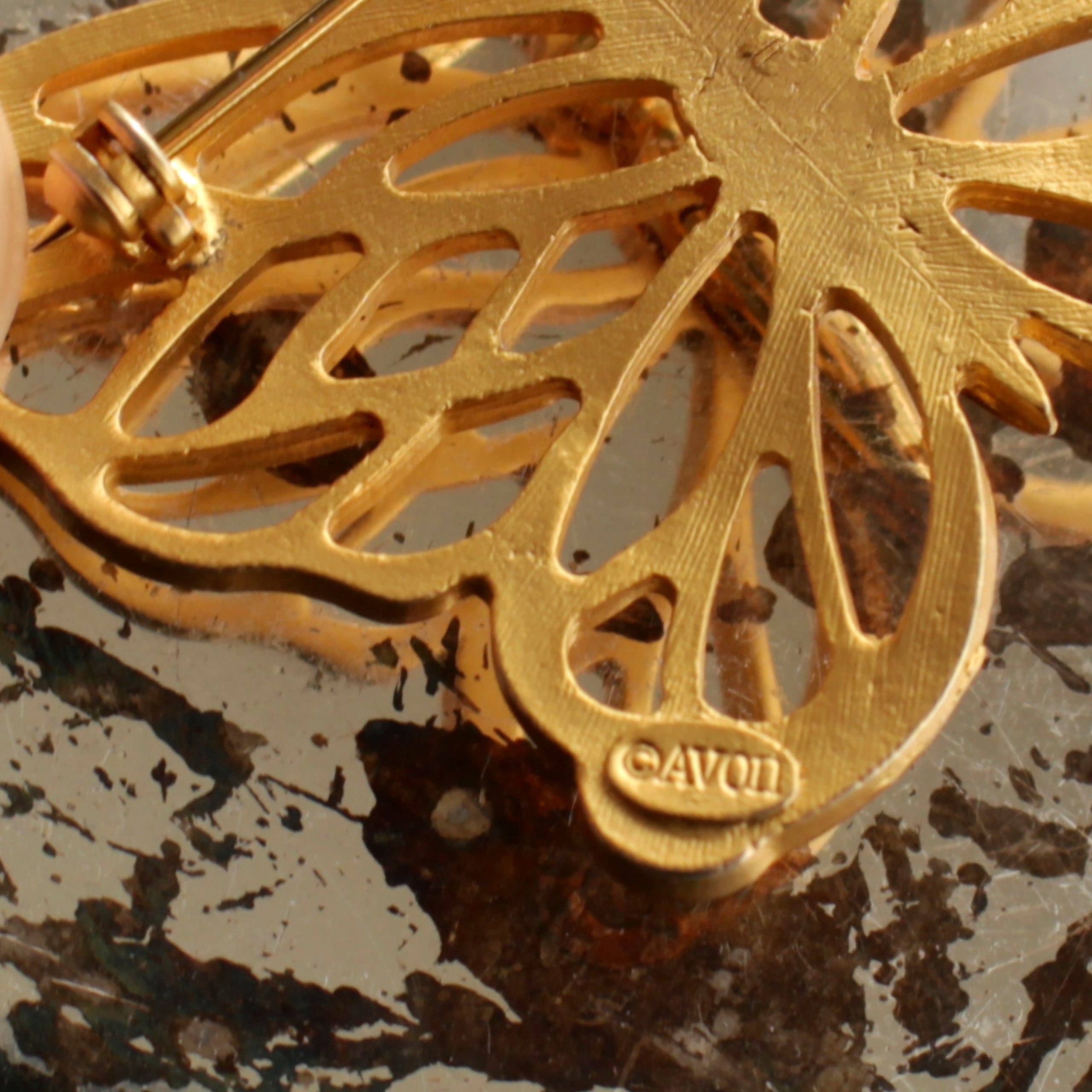 AVONのヴィンテージブローチ。透かしのデザインが上品なデザインです。ベースはマットなゴールドですが、中心にだけ艶のあるゴールドが用いられ、羽の四角にはビジューがあしらわれているため、奥行きがあり存在感ばっちりです。