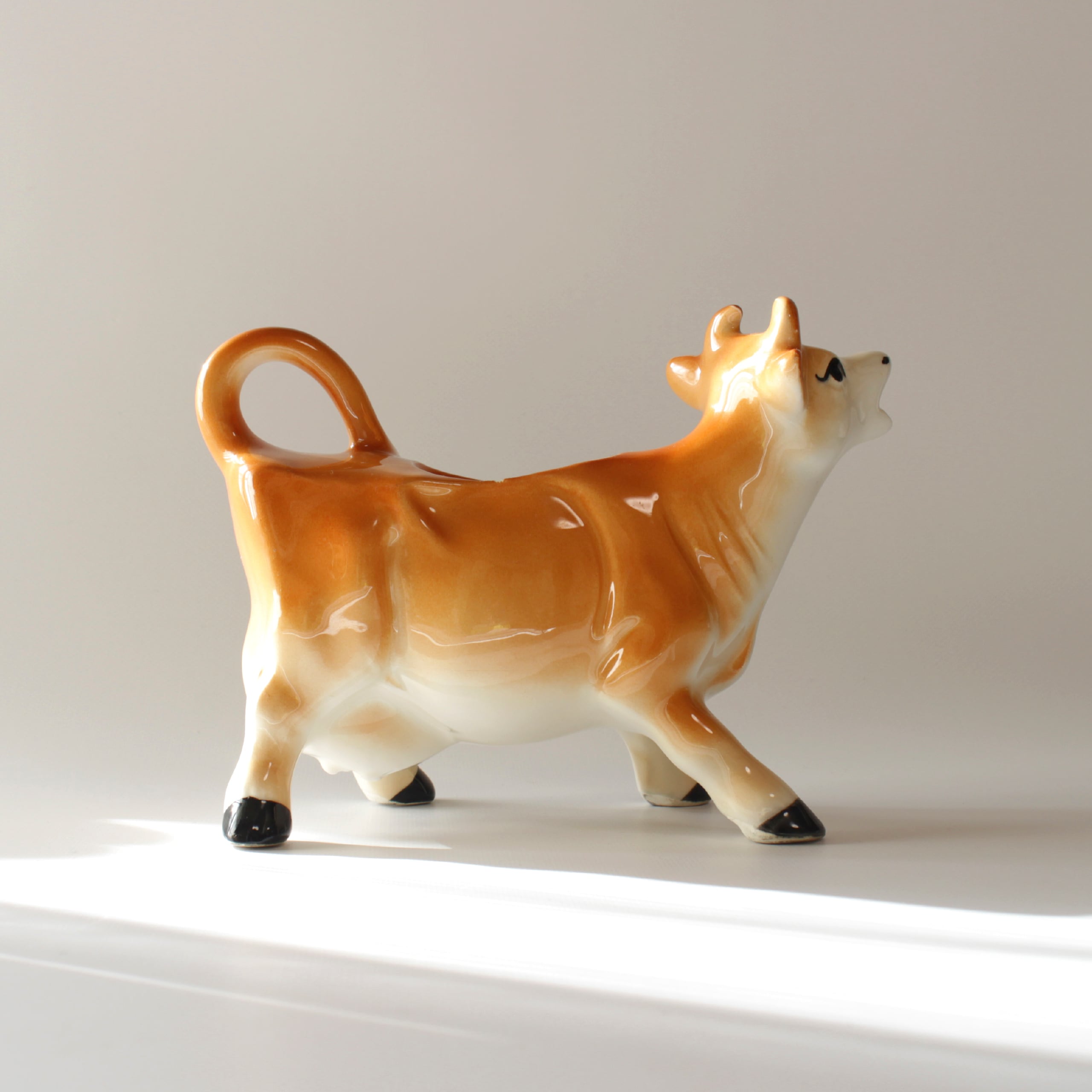 ガンジー牛がモチーフになったクリーマー。牛の口部分からカップへミルクを注ぐというユニークなデザインになっています。くるんと跳ね上がった目尻のラインや柔らかいブラウンのグラデーションなど、なんともキュートなアイテムです。オブジェや一輪挿しとしてご使用いただくのもおすすめ◎